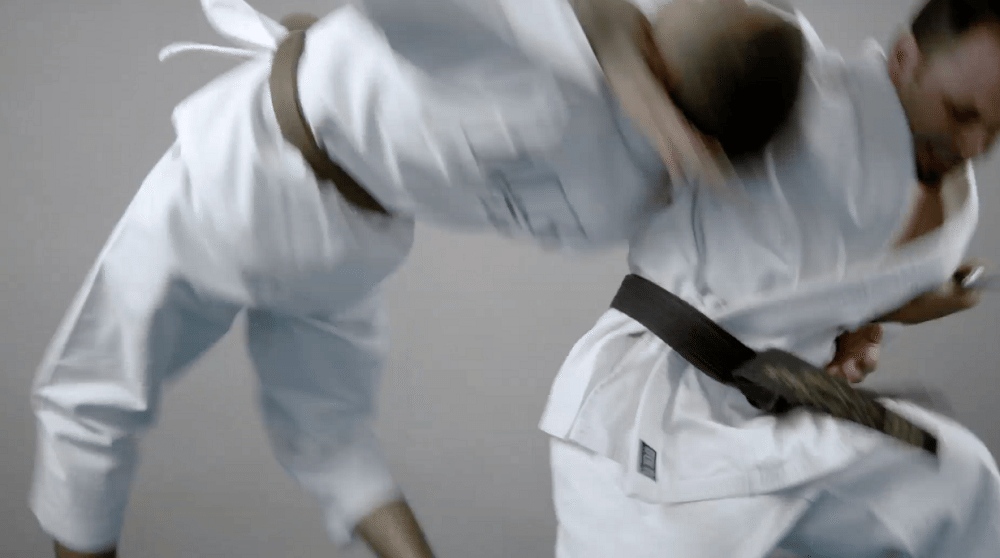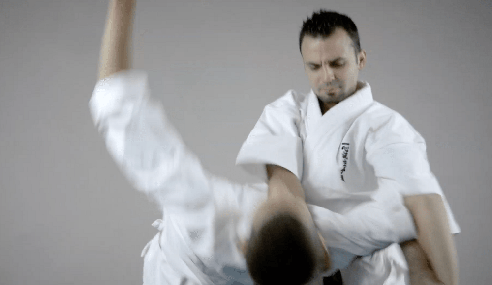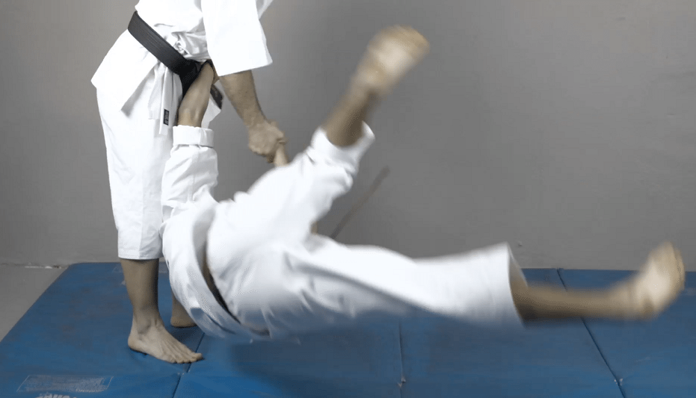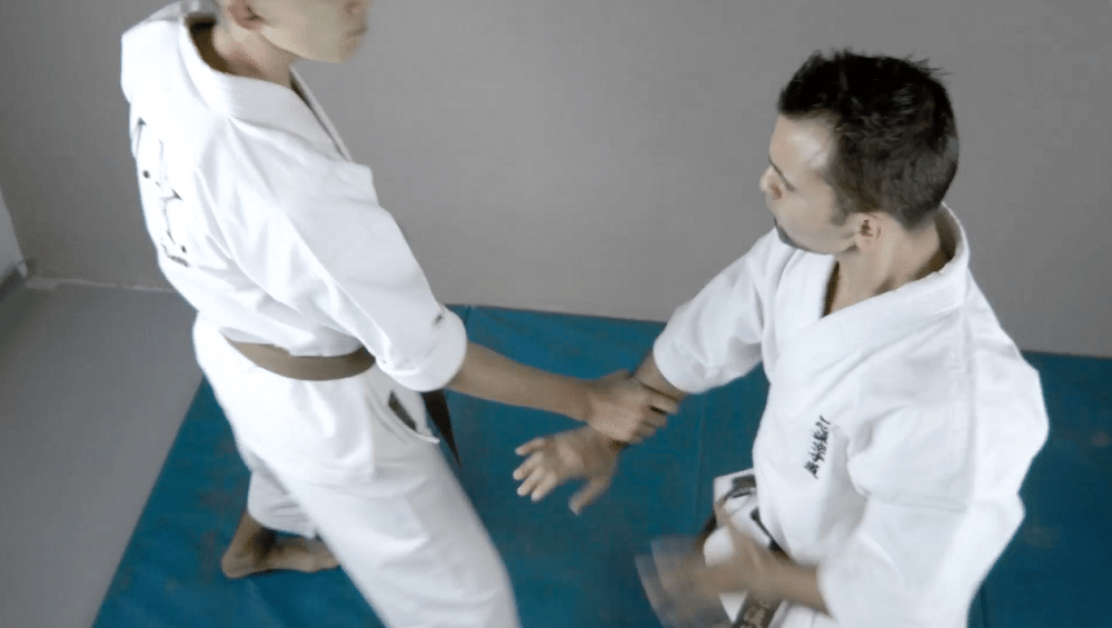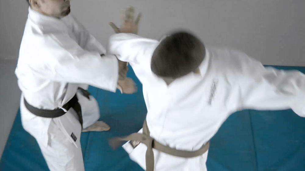 3. Ataque con doble agarre, pateando lateralmente la rodilla terminando con una tirada con dos manos