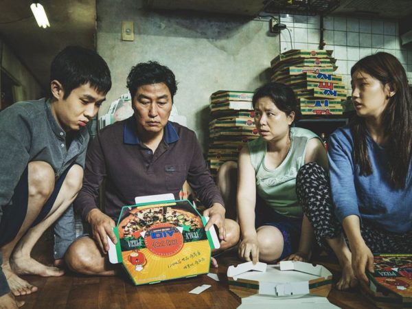 Los Kim, el bonachón Ki-taek (Kang-ho Song), su alegre esposa Chung-Sook (Hye-jin Jang), su astuta hija Ki-jung (So-dam Park) y su descarado hijo Ki-woo (Woo-sik Choi) son una familia pobre en Corea del Sur. Están tan abajo en la escala que literalmente viven debajo de la Tierra, en un sótano con vista apenas hacia la calle. La familia sobrevive doblando cajas de pizza para un jefe menor que todos ellos, y metiéndose en esquinas del apartamento para conseguir wi-fi gratis que viene de la tienda arriba de ellos.