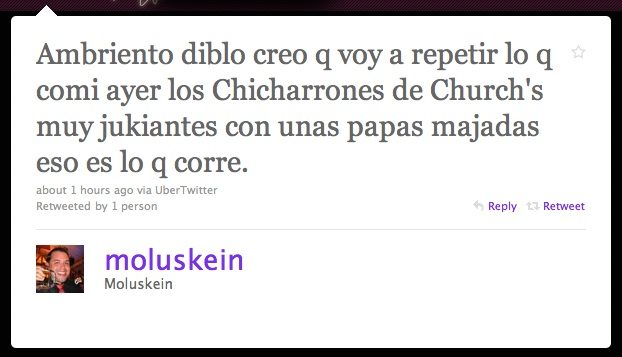 En el día de ayer surgió una polémica en el servicio de microblogging, Twitter, sobre algunos tweets que estaban realizando algunos artistas locales. Figuras como @elgangster, @RockyTheKid, @moluskein, entre otros aparentemente están incurriendo en la práctica de vender sus tweets a compañías como Church’s o KFC. Algunos de sus mensajes, aquí, aca y hasta con viideos. Al menos, ya hay quienes lo aceptaron.