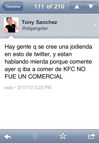 • Hay gente q se cree una jodienda en esto de twitter, y estan hablando mierda porque comente ayer q iba a comer de KFC NO FUE UN COMERCIAL”