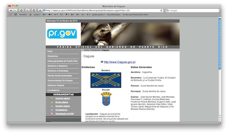 Aparte de la gran cantidad de servicios en PR.Gov, también podemos obtener información general de los municipios: topografía, gentilicios, población, patrón, gente ilustre del pueblo, parroquia, entre otros, algo que sin lugar a dudas es muy útil.