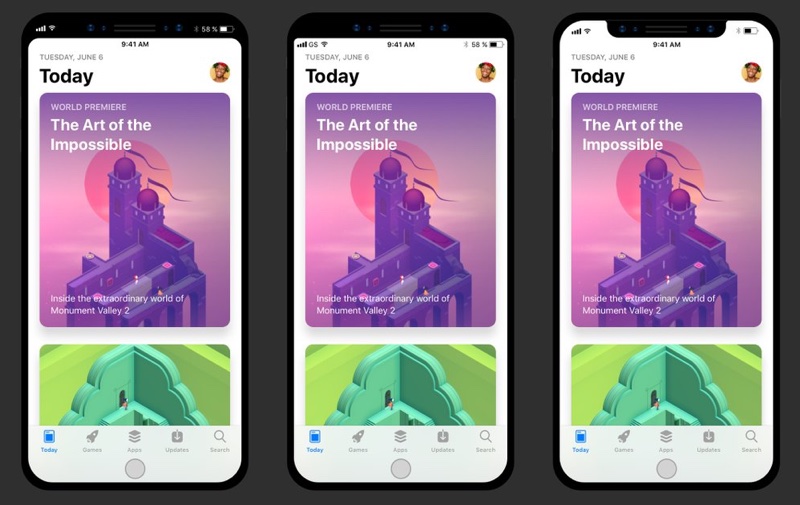 Otro detalle interesante, y el que más dudas trae es la parte superior, esa que conocemos como Barra de Estado (Status Bar). Como podemos observar, la misma estará dividida en el medio para poder acomodar la doble cámara FaceTime, la bocina y los diferentes sensores. Este pequeño detalle ha levantado curiosidad entre los fanáticos por cómo finalmente será su diseño. Petriv explora tres alternativas de cómo pudiera ser utilizando el App Store como ejemplo. Dos de las opciones disimulan la apertura al llevar la barra de estado en negra y una tercera en la que se muestra claramente.