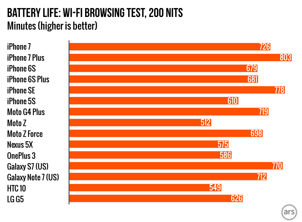 La gráfica arriba nos muestra una de las comparativas realizadas por los chicos de Ars Technica en la batería de varios terminales y en ella vemos como el iPhone 7 y 7 Plus e incluso el iPhone SE lograban números competitivos.