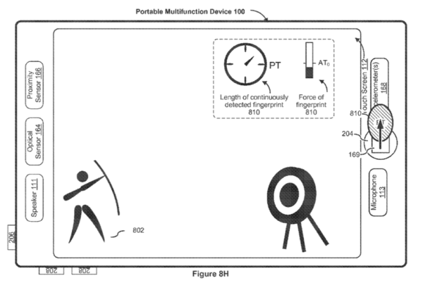Apple también ha pensado en los “gamers” y cree que Touch ID pudiera dar una mano. La patente utiliza el ejemplo de un juego de tiro al blanco, donde Touch ID sería utilizado para medir tanto la presión ejercida por la huella y el tiempo continuo de esta en el botón para apuntar y disparar. Interesante por demás esta opción ya que pudiera abrir nuevas formas de juegos en los dispositivos iOS.