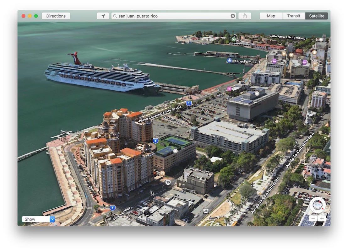 Curiosamente, aunque la página de Apple especifica que San Juan cuenta con la opción de Flyover, esta no aparece. No obstante, sí podemos recorrer la ciudad en 3D y ver monumentos históricos increíblemente recreados en 3D como El Morro, El Castillo San Cristobal, La Perla y hasta un crucero.