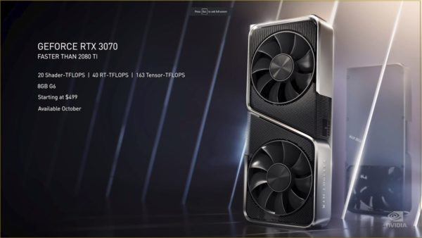 Su hermano menor lo es el GeForce RTX 3070 y este más rápido que el RTX 2080 Ti a menos de la mitad del precio, y en promedio es un 60 por ciento más rápido que el RTX 2070 original. Está equipado con 8 GB de memoria GDDR6, alcanzando el punto óptimo de rendimiento para juegos que se ejecutan en resoluciones 4K y 1440p.