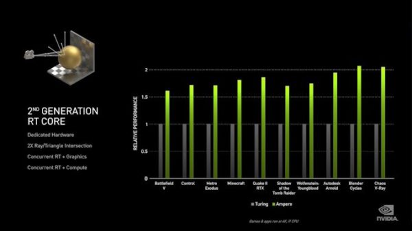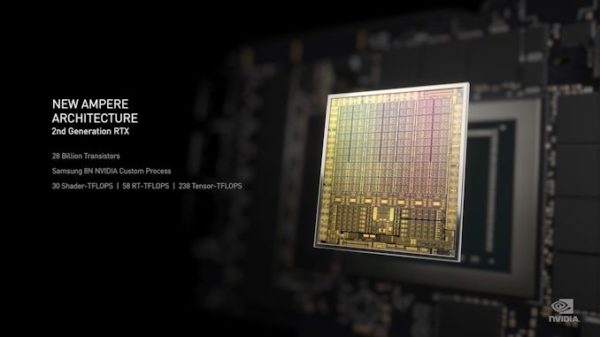 Sin irnos muy técnicos, prácticamente Ampere en su primera revisión, busca ir a nuevos hitos como la nueva herramienta organiza para hacer streaming con el doble del rendimiento FP32 de la generación anterior y 30 Shader-TFLOPS de potencia de procesamiento, con núcleos RT ofrecen el doble de rendimiento que la generación anterior, además de trazado de rayos, sombreado y cálculo simultáneos, con 58 RT-TFLOPS de potencia de procesamiento.
