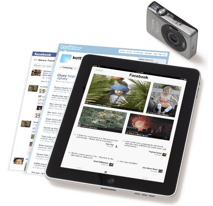 Esta revolucionaria aplicación está disponible de forma gratuita sólo para el iPad de Apple. Con FlipBoard, el usuario podrá navegar, leer, jugar y ampliar las noticias que su grupo de amigos, familiares y conocidos comparten en las redes sociales de Facebook y Twitter. El resultado es realmente bueno, imaginen por un momento poder crear una especie de Times Magazine con las noticias que comparten los periodistas que sigues en Twitter, o tu propia revista de chistes, artes, tecnología y así por el estilo.