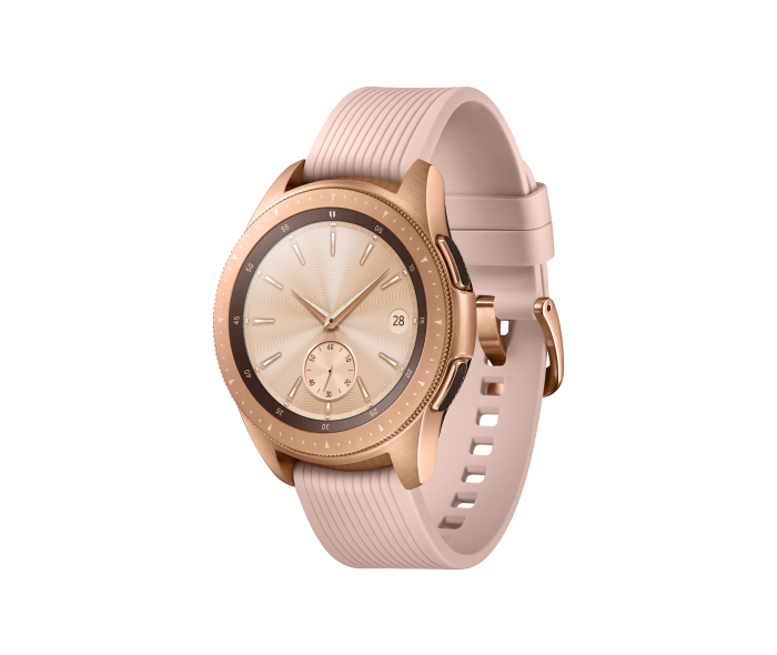 Otra de las características destacables es que el Samsung Galaxy Watch responde a más tamaños y estilos con una versión plateada de 46 mm y una opción de 42 mm en oro negro o rosa.